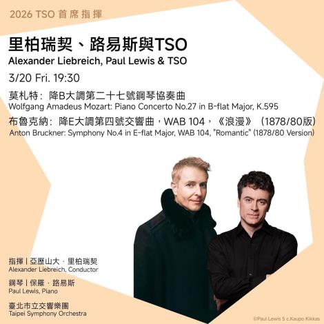 【日期‧時間‧地點】3/11(三)19:30 國家音樂廳 【演出者】指揮:亞歷山大.里柏瑞契 Alexander Liebreich, Conductor小提琴:麗莎.芭蒂雅許維莉Lisa Batiashvili, Violin大提琴:高提耶.卡普松Gautier Capuçon, Cello臺北市立交響樂團Taipei Symphony Orchestra 【演出曲目】聖桑斯:《詩人與繆思》,作品132Saint-Saëns: "La Muse et le Poète", Op.132杜布農:《沉默之詩》小提琴與大提琴協奏曲(世界首演)Richard Dubugnon: "Le poeme silencieux", Concerto for Violin, Cello and Orchestra (World Premiere)中場休息 Intermission 布拉姆斯:第四號交響曲Johannes Brahms: Symphony No.4 in E Minor, Op.98【票價】300 500 800 1200 1600 2000